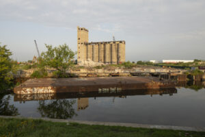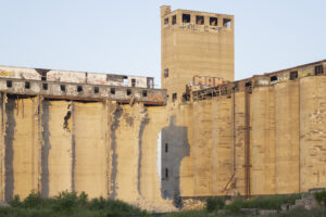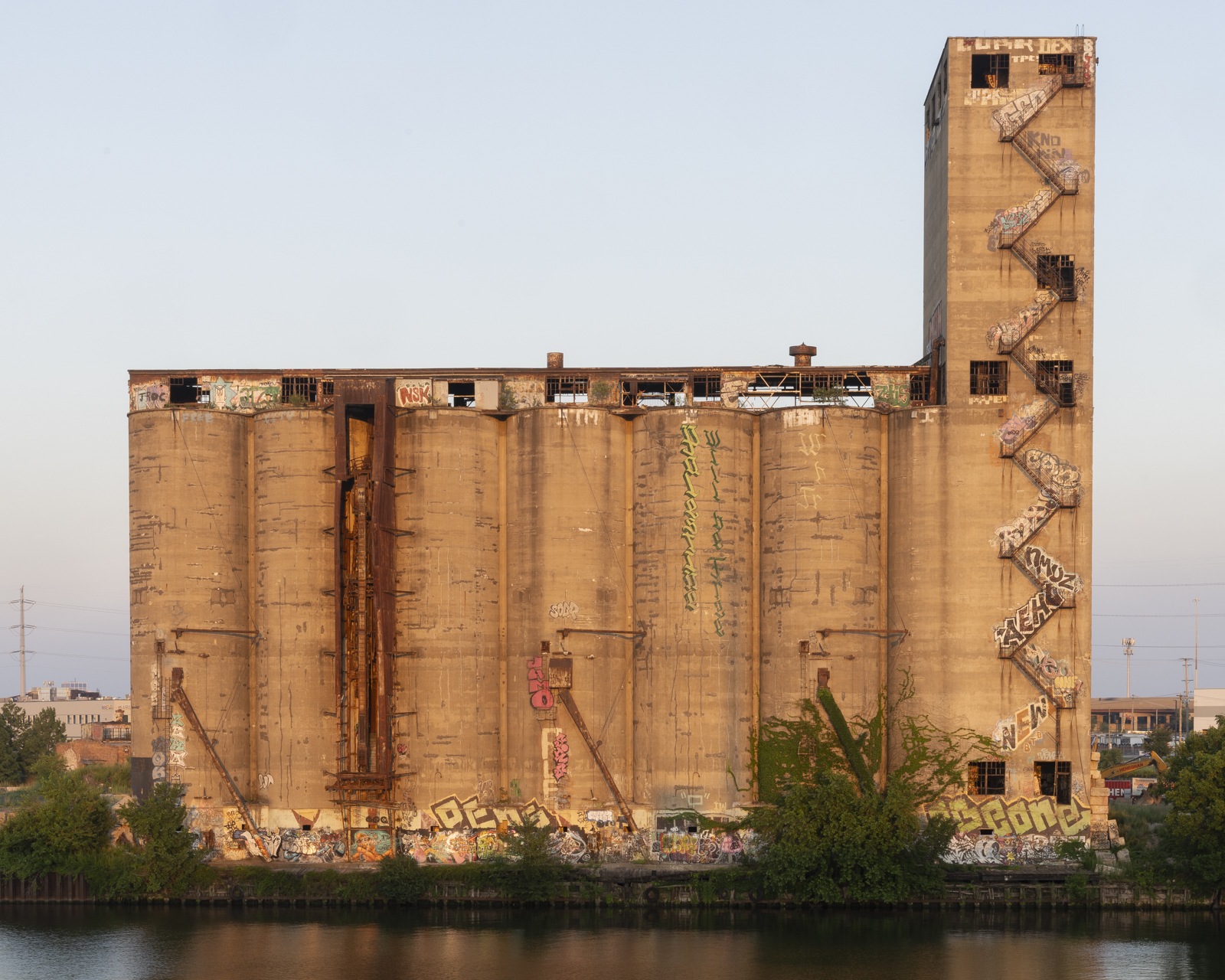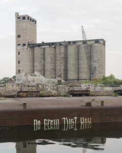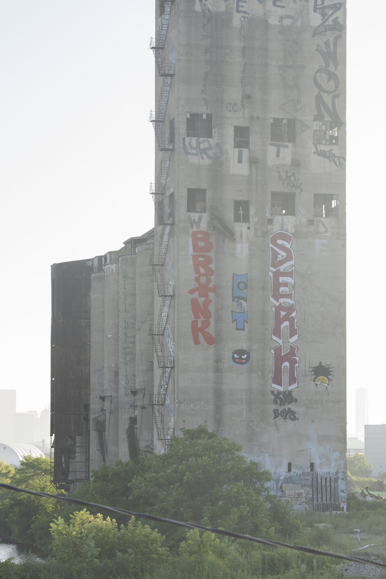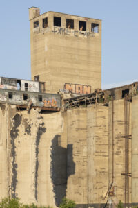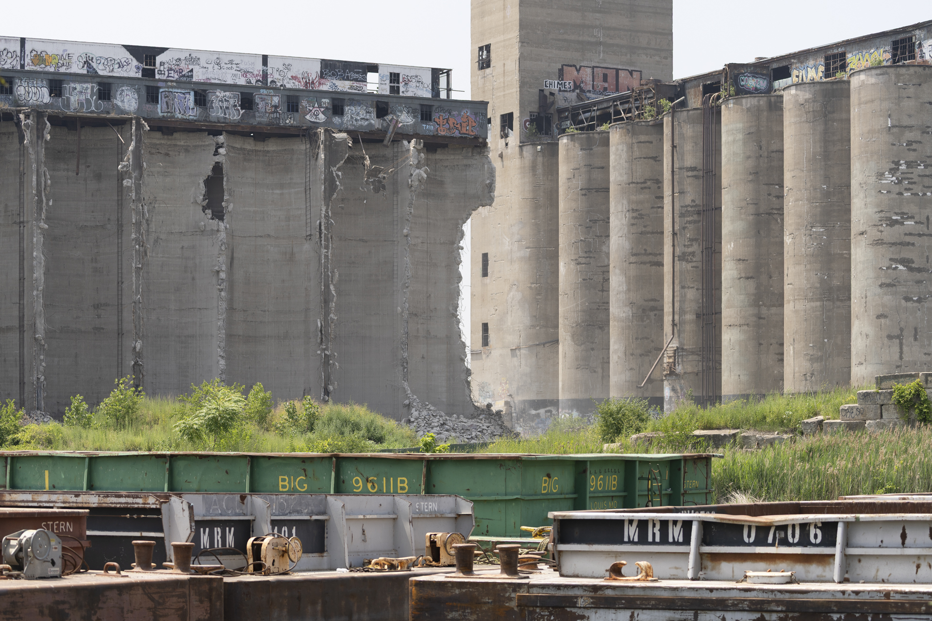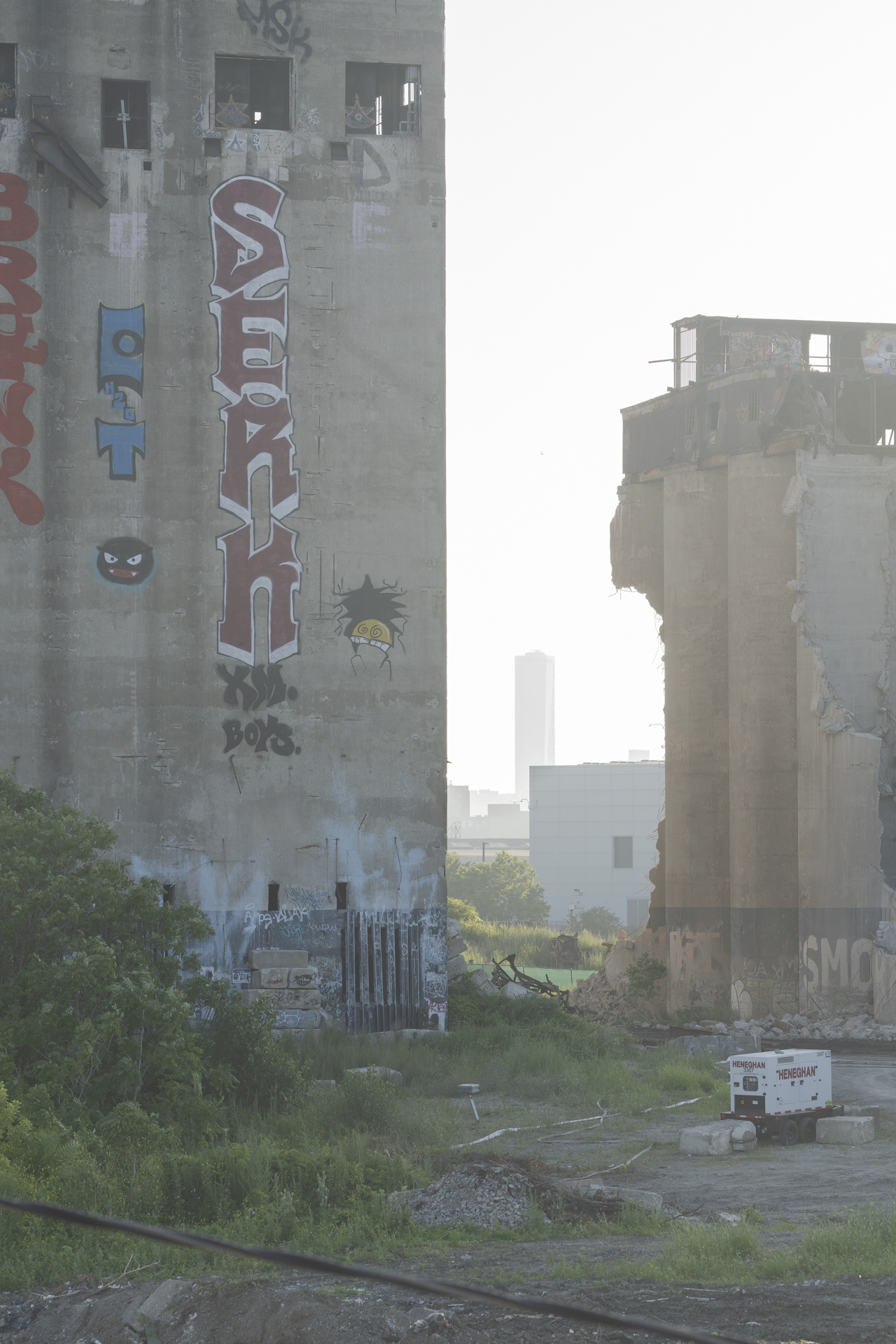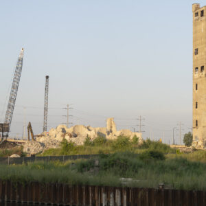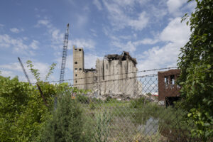 An unsorted/in-progress collection of photographs taken in July/August 2025 of the “Damen Silos” undergoing demolition, arranged chronologically.